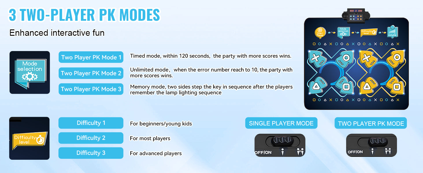 Diverse Gameplay: Boasting 2 modes (solo and dual-player PK) and 8 tracks, the single-player mode presents 8 tiers of challenges across 3 difficulty settings, while the two-player PK mode offers 3 exciting gameplay options for a constantly evolving dance experience.