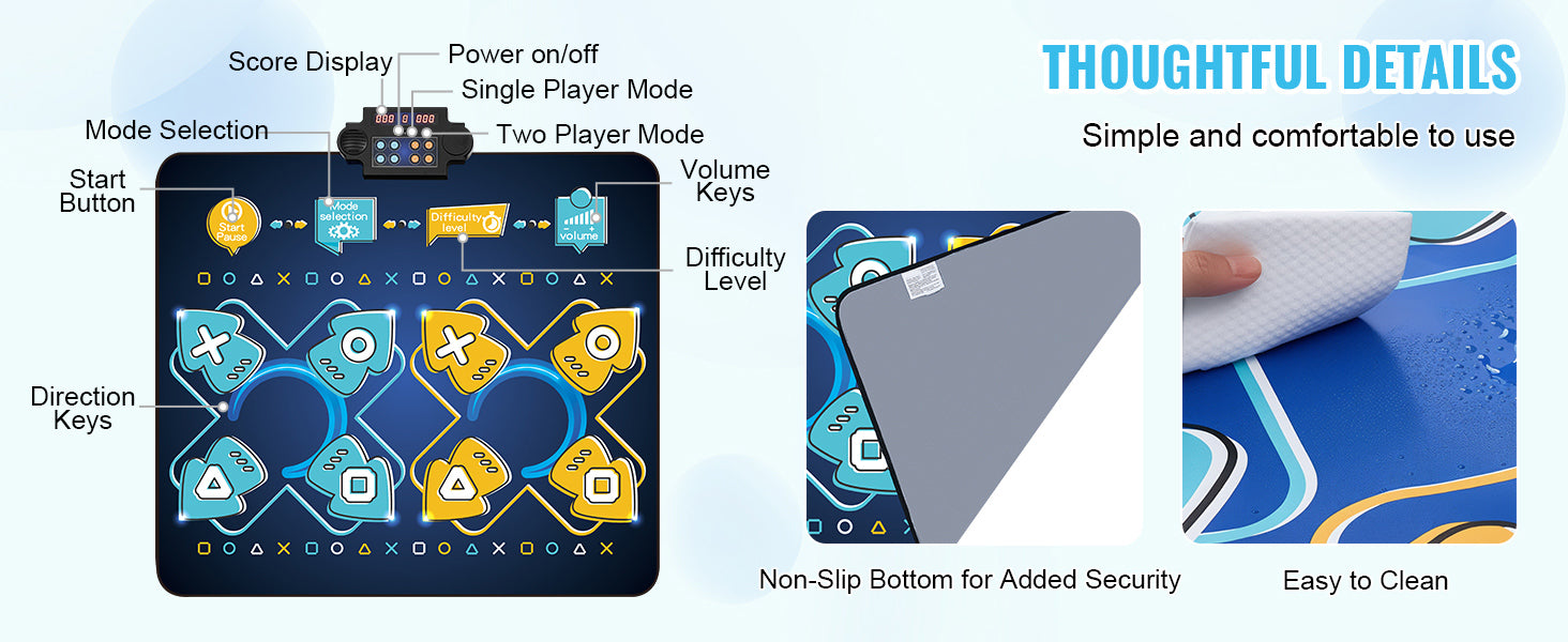 Durable and Non-Slip: Engineered from health-conscious vinyl, our dance mat is devoid of BPA and odorless. The resilient PE composite OPP surface and the grippy PEVA underside ensure stability and safety during every lively step.