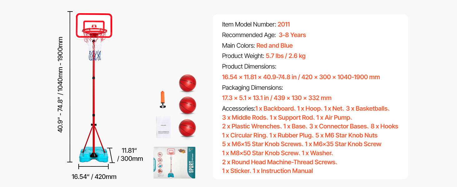 The kids basketball hoop can be adjusted from 3.4' to 6.2', with the hoop height ranging from 2.7' to 5.4'. It's easy to adjust—loosen the screws, set the steel rods to the desired height, and tighten the screws. It grows with your child.