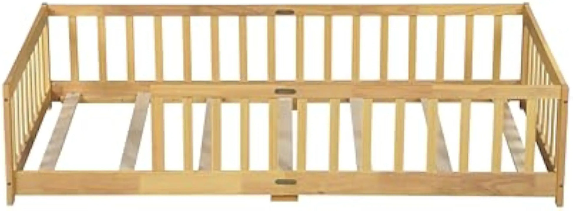 Introducing our Twin Size Montessori Floor Bed, designed to provide a safe and comfortable sleeping and play space for toddlers and children. Crafted from premium pine wood and reinforced engineered wood, this bed offers exceptional sturdiness and durability. The full surrounding safety guardrails ensure perfect protection, giving parents peace of mind while their little ones sleep or play. This floor bed features 7 reinforced plywood slats that distribute weight evenly, providing superior support and stability. It is strong enough to support up to 200 lbs, making it suitable for teens as well. The low height design encourages independence and exploration, ideal for reading, imaginative play, and fostering a Montessori-inspired environment. No box spring is needed with this bed frame; simply add a mattress up to 6 inches thick for optimal comfort. Assembly is quick and easy with included instructions and all necessary tools. We are committed to your satisfaction and offer reliable 24/7 after-sales customer service. Key Features: - Premium pine wood construction with metal hardware reinforcement - Full safety guardrails for enhanced protection - 7 reinforced plywood slats for even support - Weight capacity of 200 lbs - Recommended mattress thickness: 6 inches or less - Easy assembly with provided tools and instructions - Multifunctional use as a sleeping area and play space - Low height promotes child independence - Durable design built to last through childhood years
